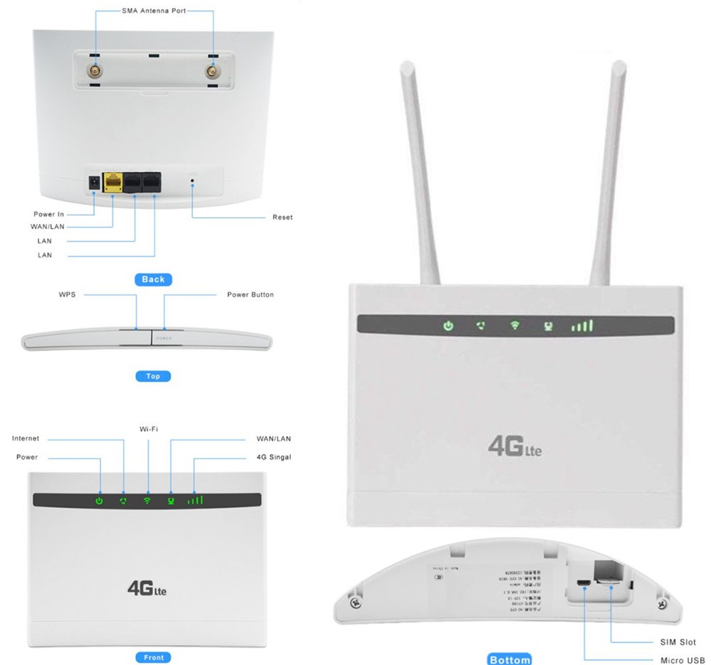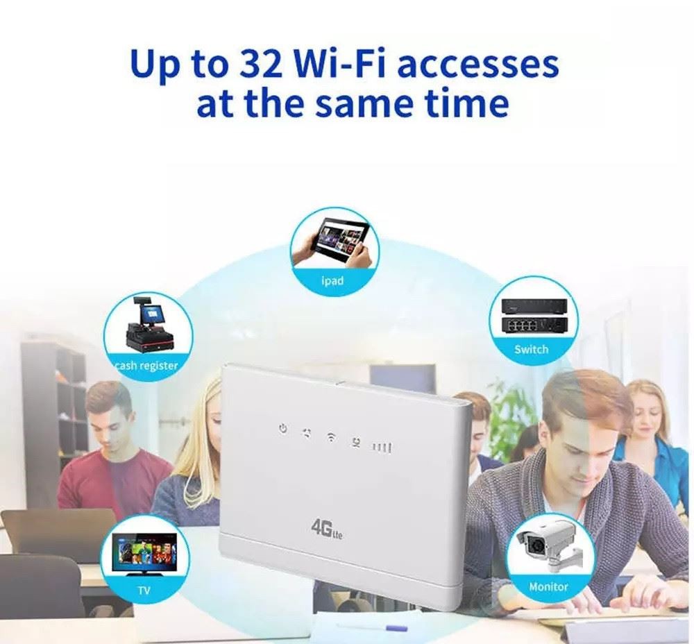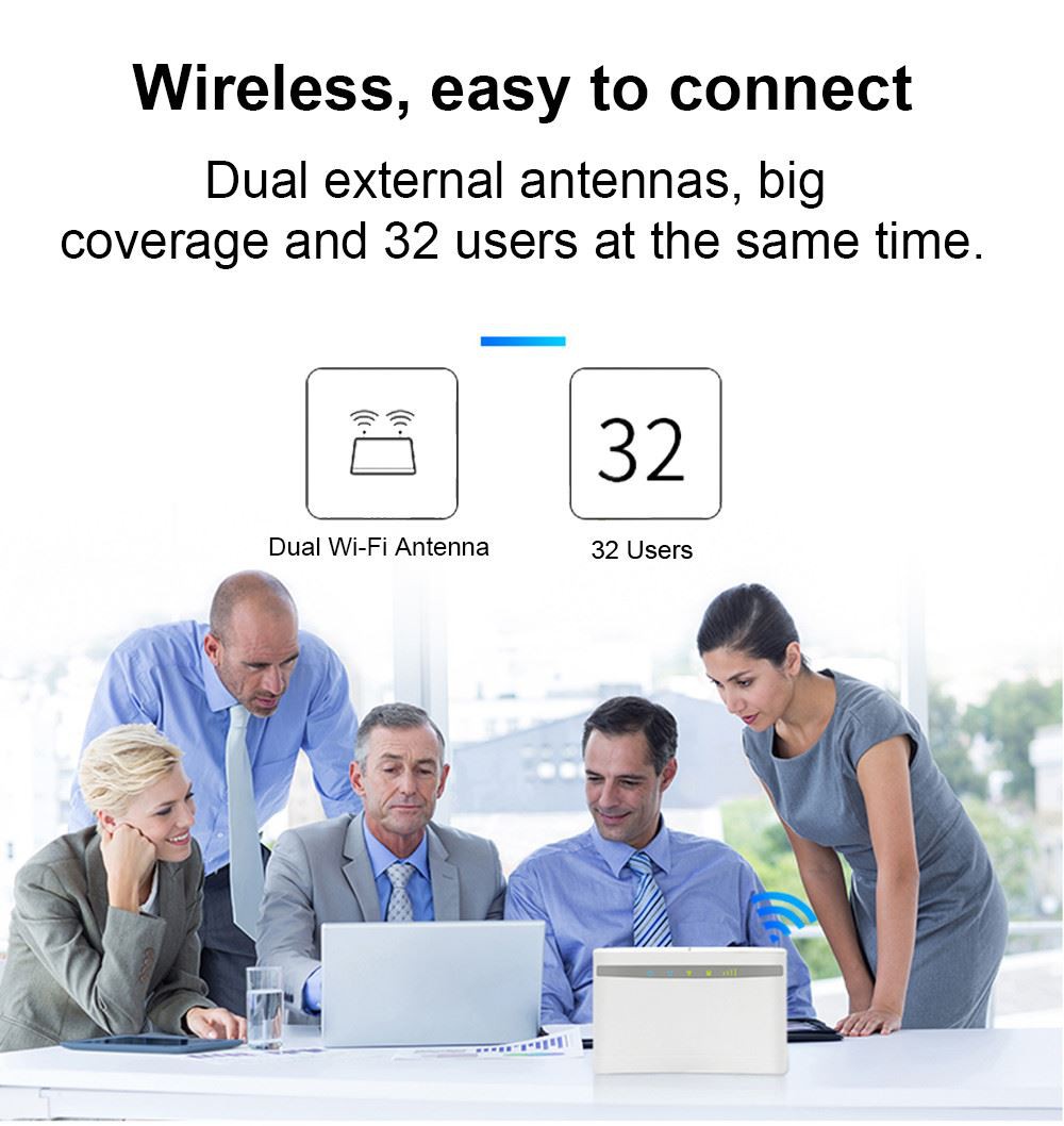 Ovo je visoko napredni LTE unutarnji CPE usmjerivač. Dizajniran je kako bi zadovoljio integrirane podatke i potrebe za Wi-Fi pristupom za stambene, poslovne i poslovne korisnike. (može se spojiti na vanjske antene SMA konektora !) 150M velika brzina, LTE FDD: DL / UL 150M / 50 Mbps (Cat 4). Prijenos 4G na Wi-Fi, Nema potrebe širokopojasni pristup, umetnite SIM karticu, uključi i radi. WiFi Pokriva cijeli stan i kuću, uživajte u brzom internetu svugdje. Jednostavan za spajanje, dvostruke vanjske antene, velika pokrivenost i 32 korisnika u isto vrijeme.